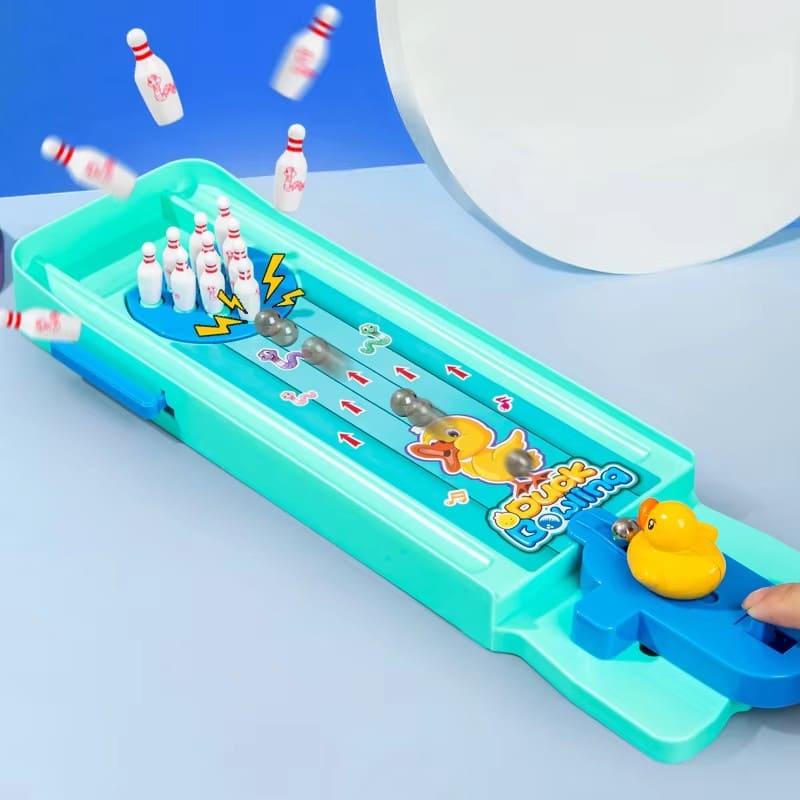 Detta mini fingerbowling-spel är ett underhållande bordsspel för både barn och vuxna. Den lekfulla designen med en gul anka och startramp gör spelet extra attraktivt och skiljer det från vanliga bowlingleksaker. Perfekt för hemmalek, kontoret eller som pausaktivitet som lockar till skratt och tävling.
